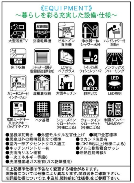 LDK15帖以上制震構造床下収納小屋裏収納複層ガラス食器洗浄機ガスコンロシステムキッチンカウンターキッチン3口以上コンロパントリー(食器・食品の収納庫)トイレ2ヶ所温水洗浄便座シャワー付洗面台浴室乾燥機追焚機能TV付浴室浴室に窓ウォークインクローゼットTVモニタ付インターホンEV車充電設備陽当り良好