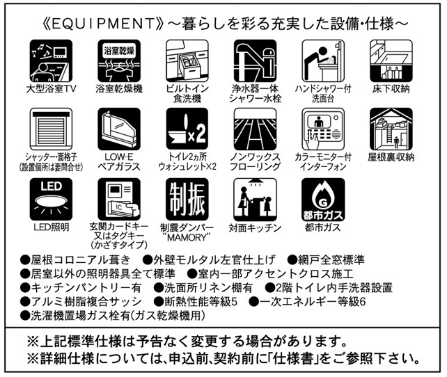 閑静な住宅地LDK15帖以上制震構造床下収納小屋裏収納複層ガラス食器洗浄機ガスコンロシステムキッチンカウンターキッチン3口以上コンロパントリー(食器・食品の収納庫)トイレ2ヶ所温水洗浄便座シャワー付洗面台浴室乾燥機追焚機能TV付浴室浴室に窓TVモニタ付インターホンEV車充電設備