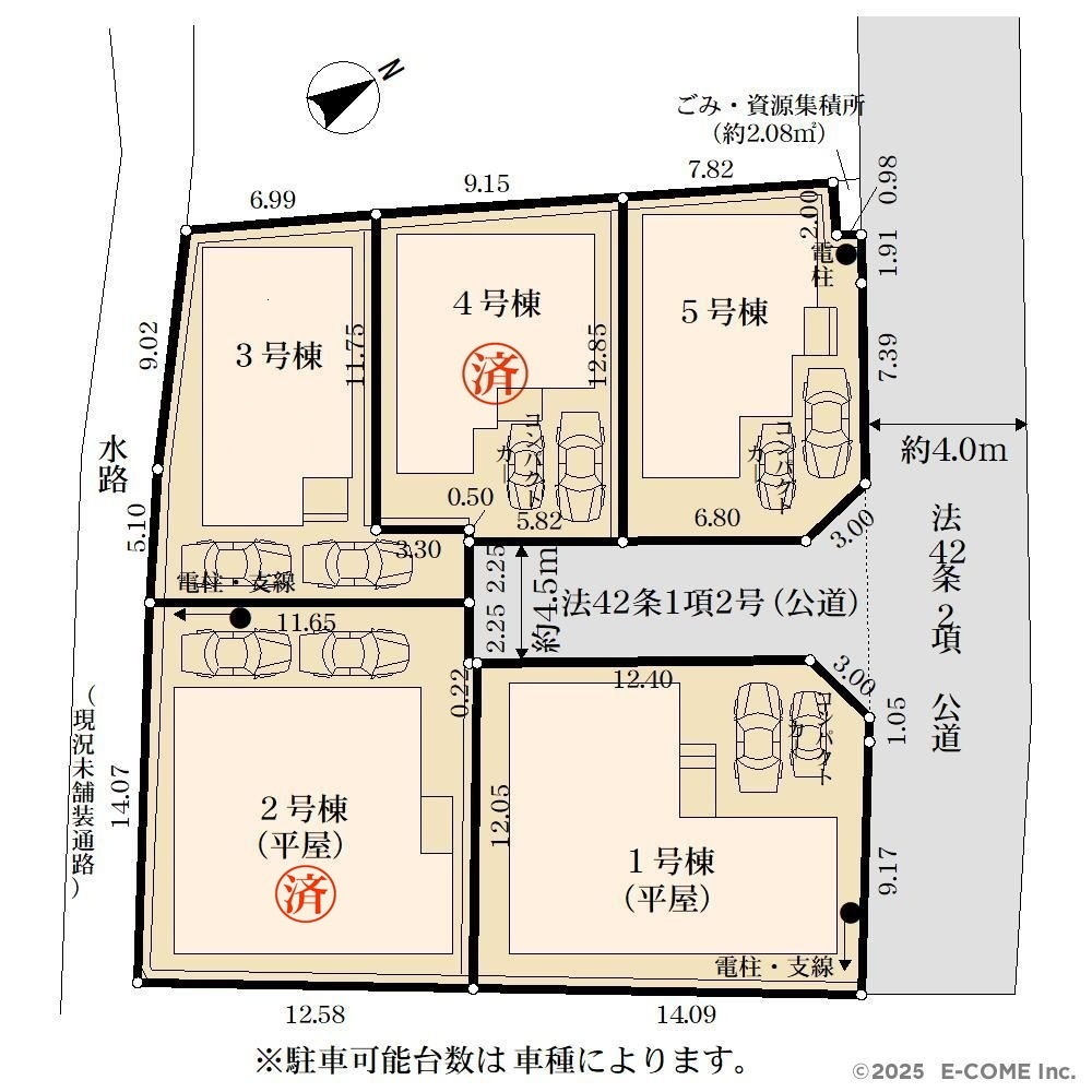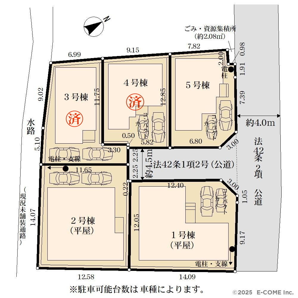 *1,2号棟 ⇒ 平屋(3LDK)、3,4,5号棟 ⇒ 2階建て(4LDK)