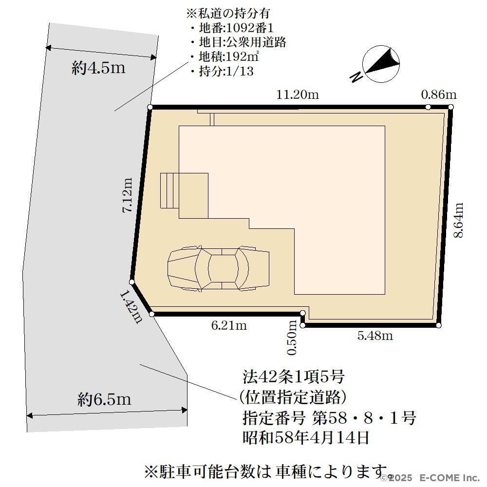 | 土地面積 | 103.61m² (私道192m²別に有、私道持分比率:1/13、31.34坪) | ||