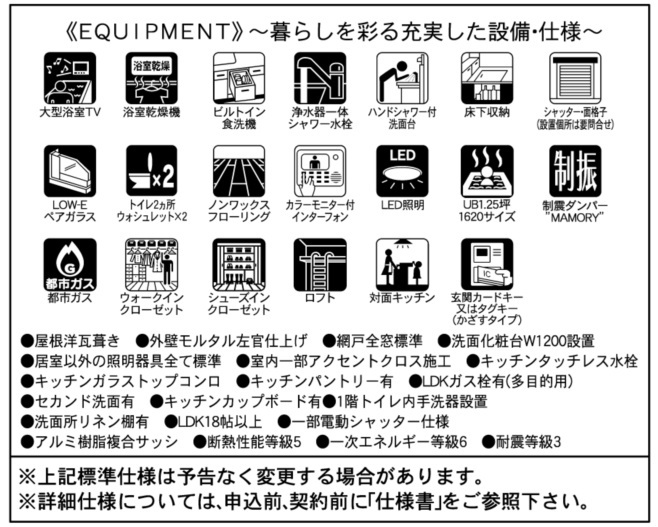 閑静な住宅地LDK15帖以上制震構造省エネ・エコ住宅床下収納複層ガラス食器洗浄機浄水器カウンターキッチンパントリー(食器・食品の収納庫)トイレ2ヶ所温水洗浄便座シャワー付洗面台浴室乾燥機浴室暖房追焚機能TV付浴室オートバス全居室フローリングロフトTVモニタ付インターホンスマートキーEV車充電設備24時間換気システム
