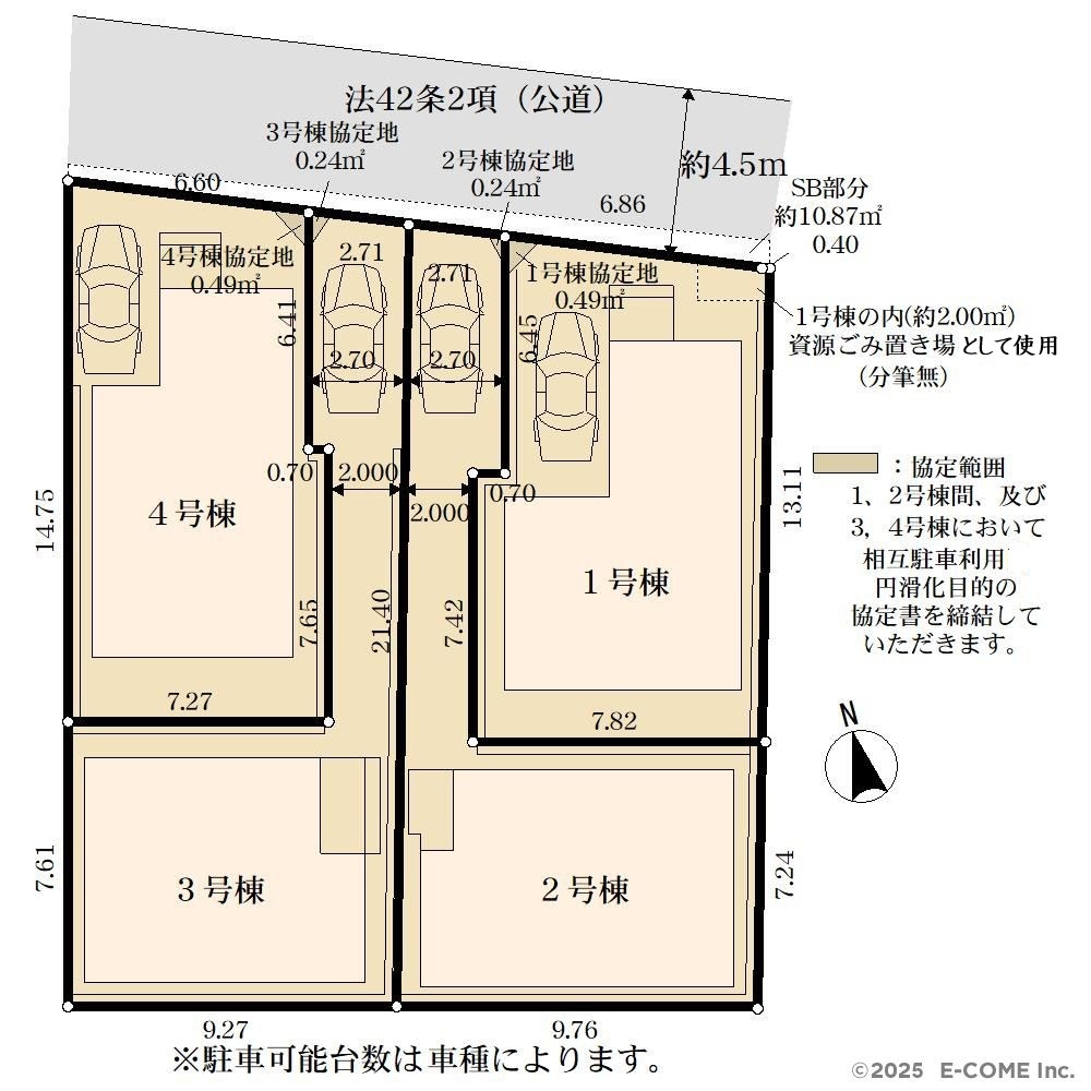 | 備考・制限等 | *SB部分(約10.87平米)は、分筆後区に移管予定です *協定地有(1,2号棟間及び3、4号棟間において相互駐車利用円滑化目的の協定書を締結して頂きます(1号棟:0.49平米、2号棟 0.24平米、3号棟 0.24平米) *1号棟の内(約2.00平米)資源ごみ置き場として仕様(分筆無) ※広告不可、※専任あり |