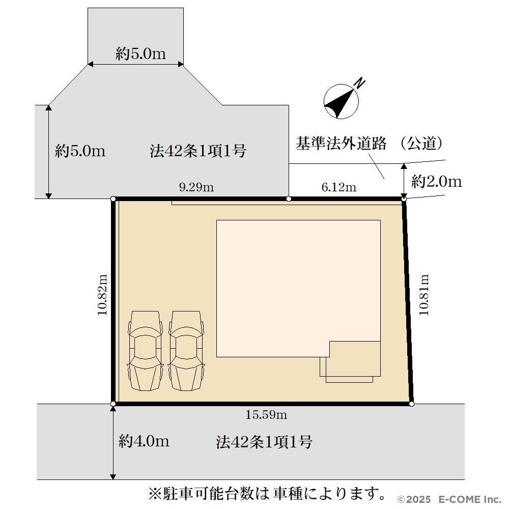 | 接道 | 南東側4M道路に15.59M接道 北西側5M道路に9.29M接道 |