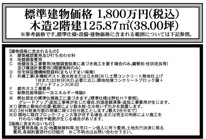 *標準建物価格(イーカム施工):1800万円(125.87平米、38.00坪、2階建)