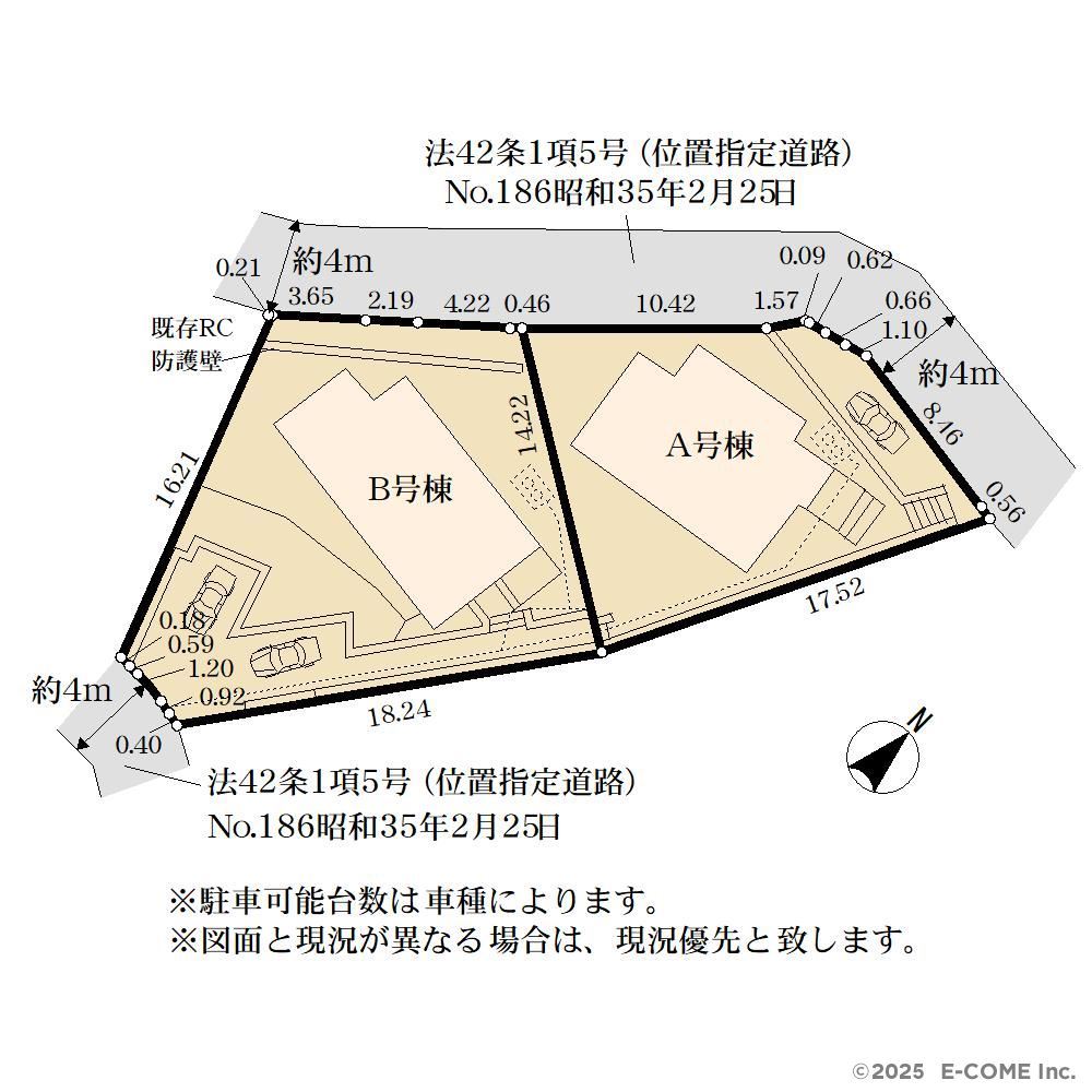 | 備考・制限等 | *A号棟 建築確認対象面積:178.16平米(53.89坪)北側道路提供部分(約35.84平米)を除外して申請 *B号棟 建築確認対象面積:246.66平米(74.62坪)北側及び南側道路提供部分(約24.34平米)を除外して申請 *道路提供部分持分有(A号棟:約35.84平米、B号棟:約24.34平米) *南・北側の私道の通行・掘削承諾書無 *A号棟の浄化槽の放流はB号棟敷地南東側を経由してB号棟南側の側溝へ接続されております ※広告不可 |