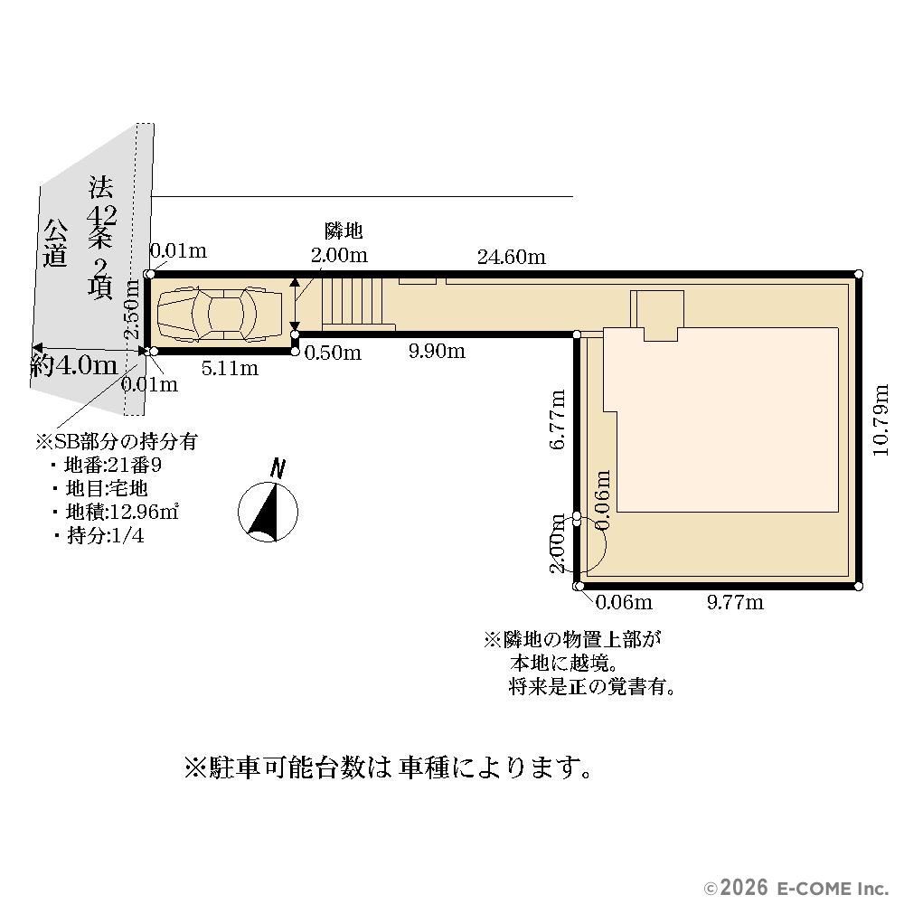 | 備考・制限等 | *SB部分の持分有:12.96平米 持分1/4 *隣地の物置上部が本地へ越境(将来是正の覚書有) *建築確認対象面積:137.69平米(41.65坪)、西側隣地の物置屋根の一部越境部分約0.118平米、及び道路境界ラインより10ミリセットバックしたラインより約1センチ後退した約0.025平米を除外して申請) |