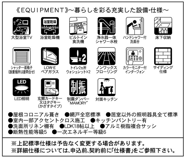 LDK15帖以上制震構造床下収納複層ガラス食器洗浄機省エネ給湯器ガスコンロシステムキッチンカウンターキッチン3口以上コンロパントリー(食器・食品の収納庫)トイレ2ヶ所温水洗浄便座シャワー付洗面台浴室乾燥機追焚機能TV付浴室浴室に窓TVモニタ付インターホンEV車充電設備