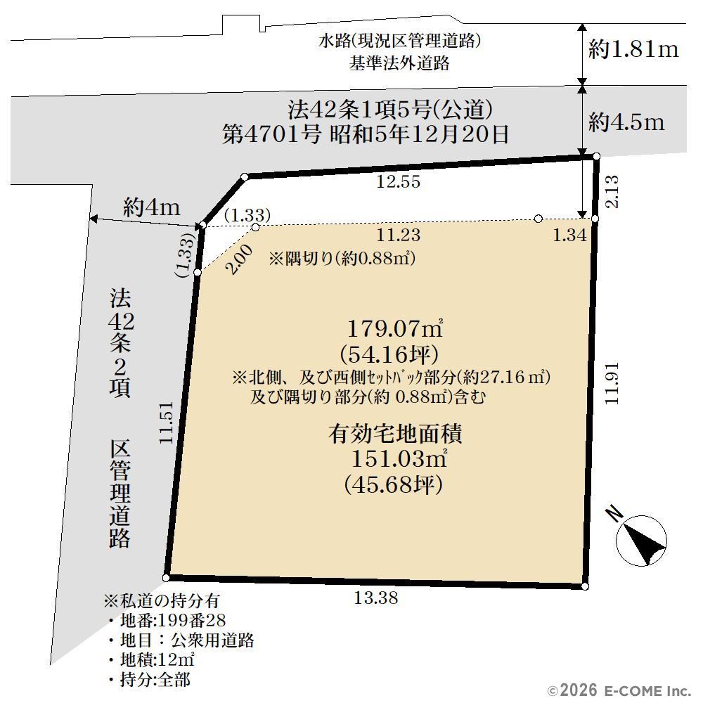 | 土地面積 | 179.07m² (私道12m²別に有、セットバック27.16m²、54.16坪) | ||