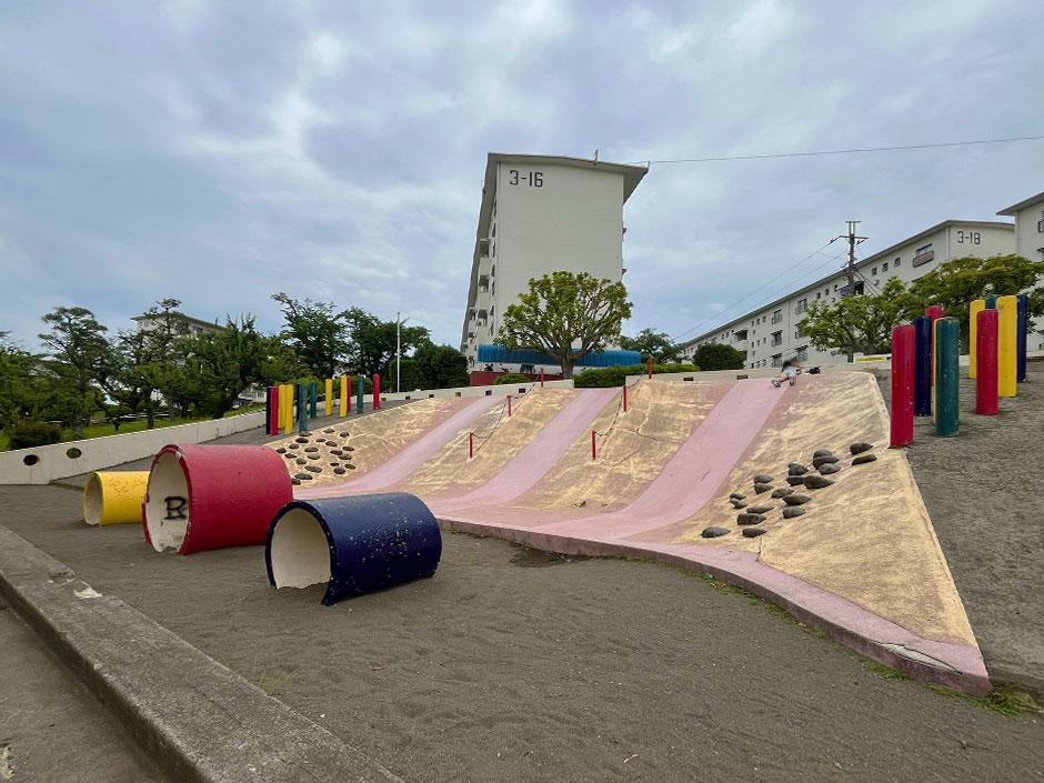旭区左近山団地内にあるジャンボ公園は、巨大なコンクリート滑り台が3基並ぶ、昭和の面影を色濃く残すユニークな公園です。段ボールを敷いて滑るとスピード感満点で、子どもたちは何度も挑戦しては歓声を上げます。滑り台の下には小さな土管が設置され、砂場としても人気。ごっこ遊びや隠れ家のように使える工夫も施されています。階段や傾斜を活かした作りは、鬼ごっこにも最適。併設のベンチや近隣の商店街もあり、のびのびと遊べる昔ながらの魅力が詰まったスポットです。