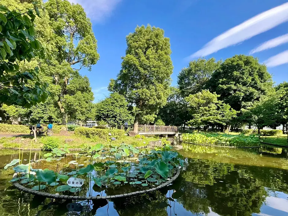 府中駅から徒歩約7〜10分、寿町に位置する寿中央公園は、自然と遊びが融合した地域の憩いのスポットです。園内にはすべり台やブランコ、鉄棒、砂場など豊富な遊具があり、子どもたちがのびのび遊べる広場も整備されています。東側の芝生広場には「ひょうたん池」があり、初夏には大賀蓮や舞妃蓮が美しく咲き、訪れる人々の目を楽しませます。春は桜が咲き誇り、「府中市民桜まつり」も開催されます。市民プールやテニスコートも併設され、全年代が楽しめる公園です。