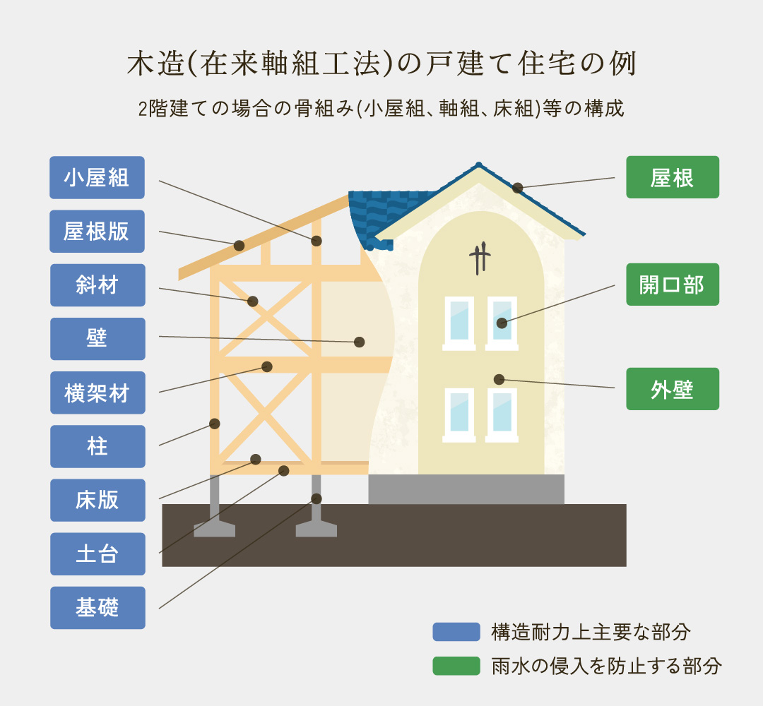 イーカムの建物には、10年間の「建物保証」が付きます。基礎・床・柱・梁・壁などの「構造耐力上主要な部分」と、外壁・サッシ・屋根など「雨水の浸入を防止する部分」に対し、お引き渡しの日から10年間、品質を保証します。※図は保証の範囲です。