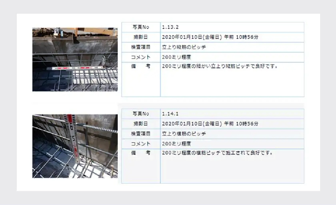 検査員による厳正な検査結果は、すべての項目について明解な写真と、「写真No」「撮影日」「検査項目」「コメント」「備考」が記入され、イーカムに報告されます。