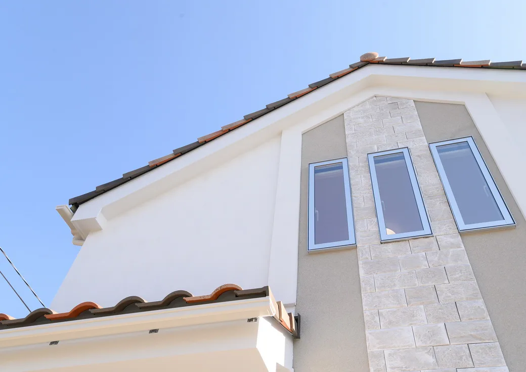 屋根:洋瓦葺き 外壁:モルタル左官仕上げ(一部タイル使用)