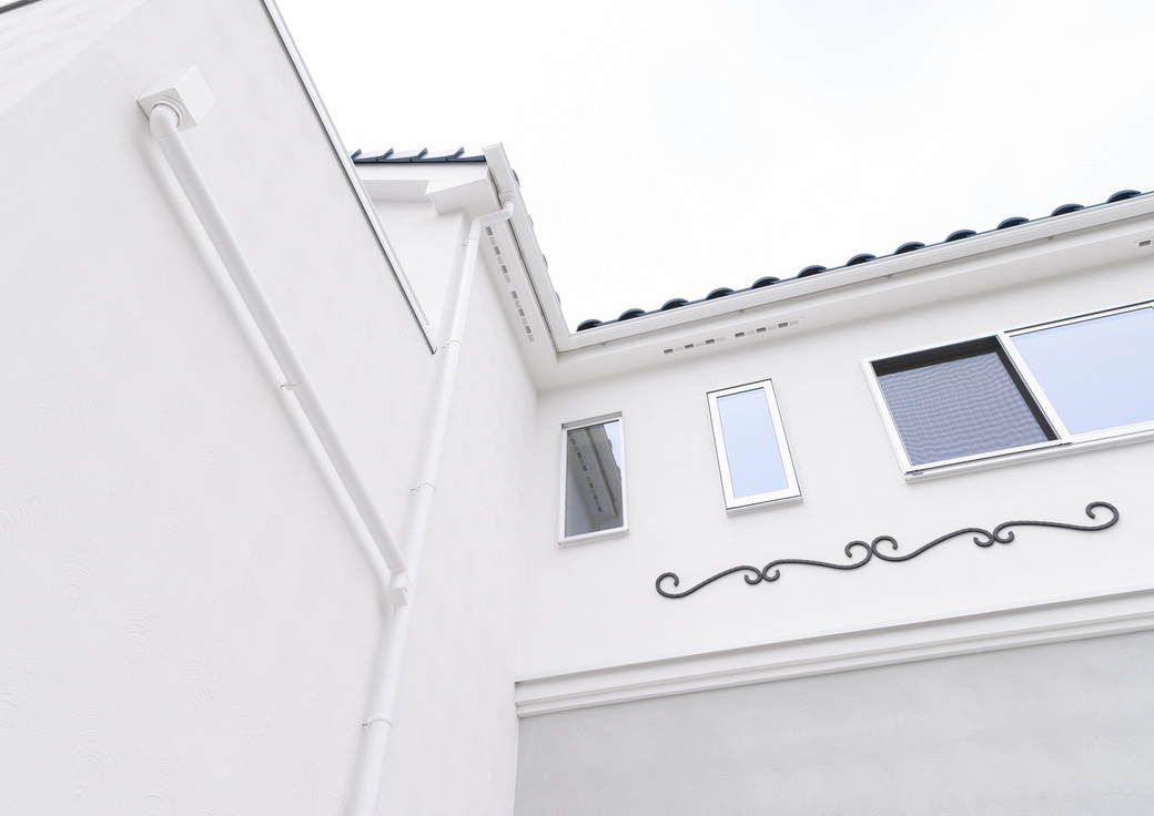 屋根:洋瓦葺き 外壁:モルタル左官仕上げ・壁飾り付