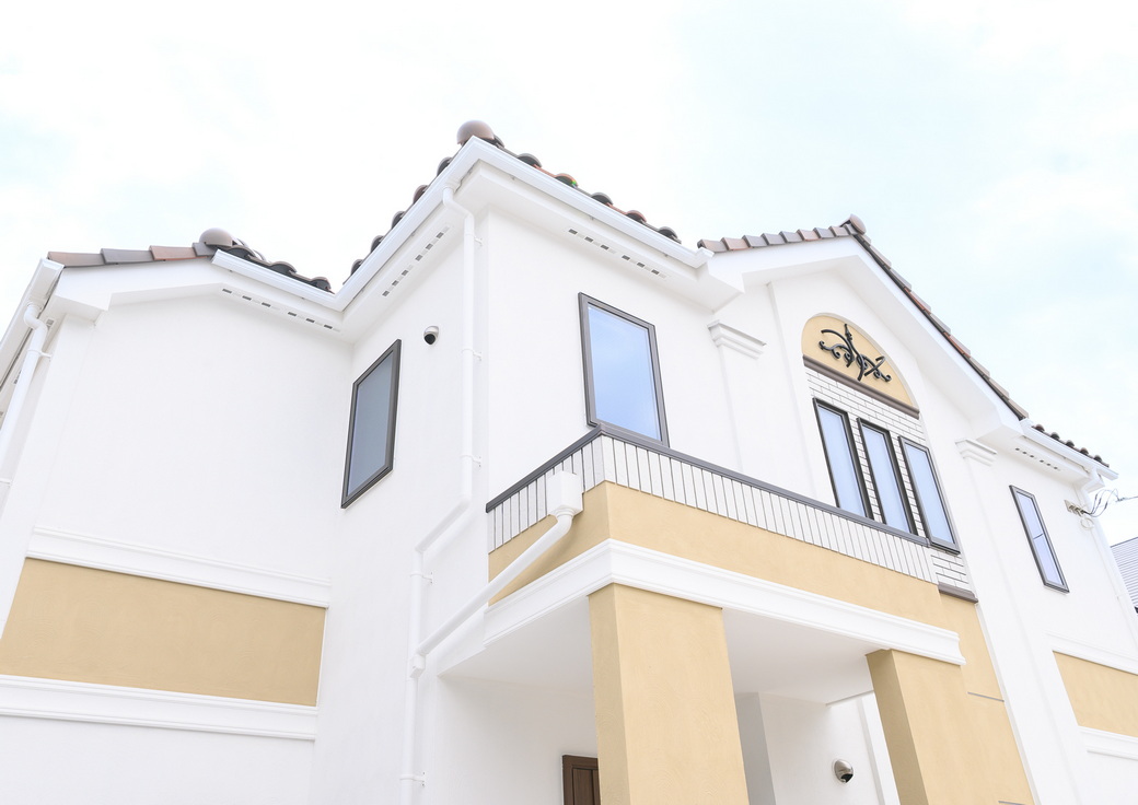 屋根:洋瓦葺き・外壁:モルタル左官仕上げ(一部タイル貼り)・壁飾り付